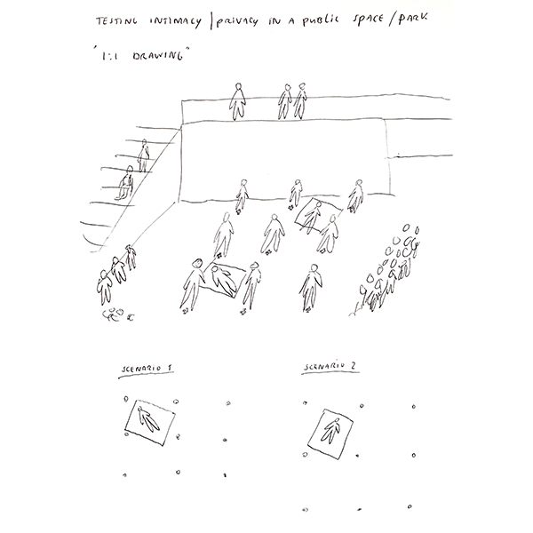 Im Rahmen des Workshops erkundeten die Teilnehmenden das Verhältnis von Zeichnung, Raum und Kontext anhand einer 1:1-Inszenierung des Oerliker Parks. Eine Gruppe von Studierenden untersuchte unterschiedliche Dichten und Grade räumlicher Intimität, indem sie einen Ausschnitt des Parks „aufführte“ – sie positionierten sich zueinander, um räumliche Anordnungen und soziale Interaktionen zu simulieren.