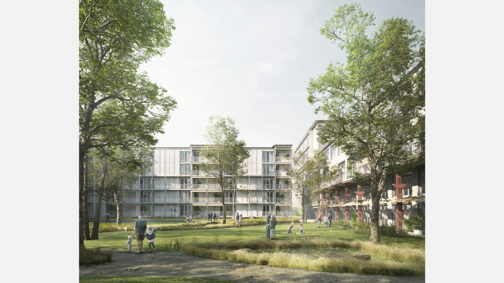Ein zentrales Ziel des Entwurfs ist es, das Quartier zu beleben. Um dies zu erreichen, ist das Erdgeschoss als durchlässige, öffentlich zugängliche Raumstruktur konzipiert. Neue Verbindungen von der Gasse zum Park, ein großzügiger Durchgang unter dem gestuften Gebäude und die Gestaltung der erhöhten Erdgeschosswohnungen verbinden den Grünraum mit dem ehemaligen Industrieareal. Das Ergebnis ist ein lebendiges, voll aktives Erdgeschoss mit hoher räumlicher Offenheit und Aufenthaltsqualität – sowohl an den Rändern als auch innerhalb des Komplexes.