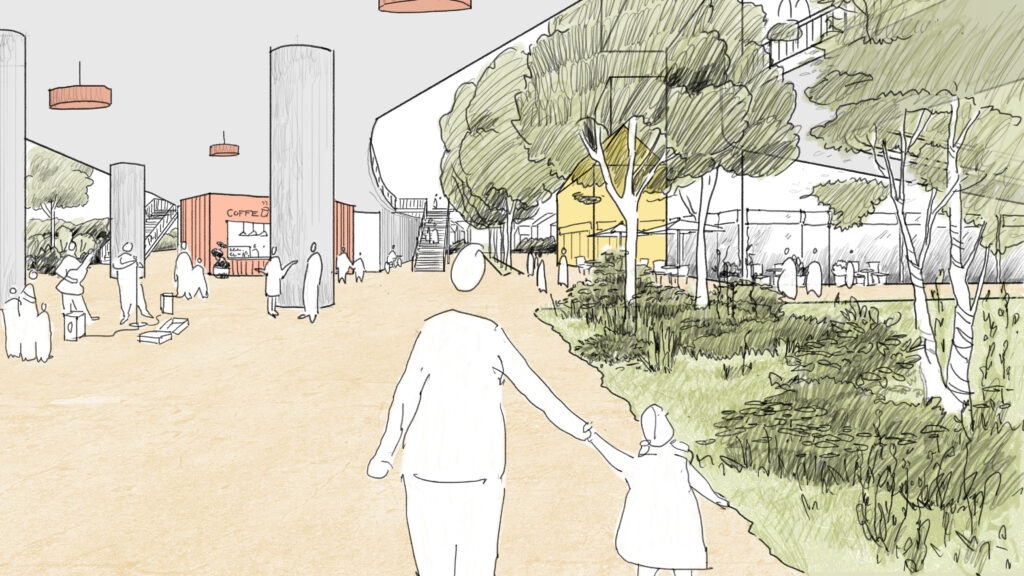 In Karlsruhe hatten wir die Möglichkeit, ein neues Gewerbe- und Handelsgebiet neben der Grünwinkler Brücke zu entwerfen. Bis die neuen Gebäude fertiggestellt sind, bietet sich jedoch die einmalige Chance, den darunter liegenden Raum zu aktivieren.