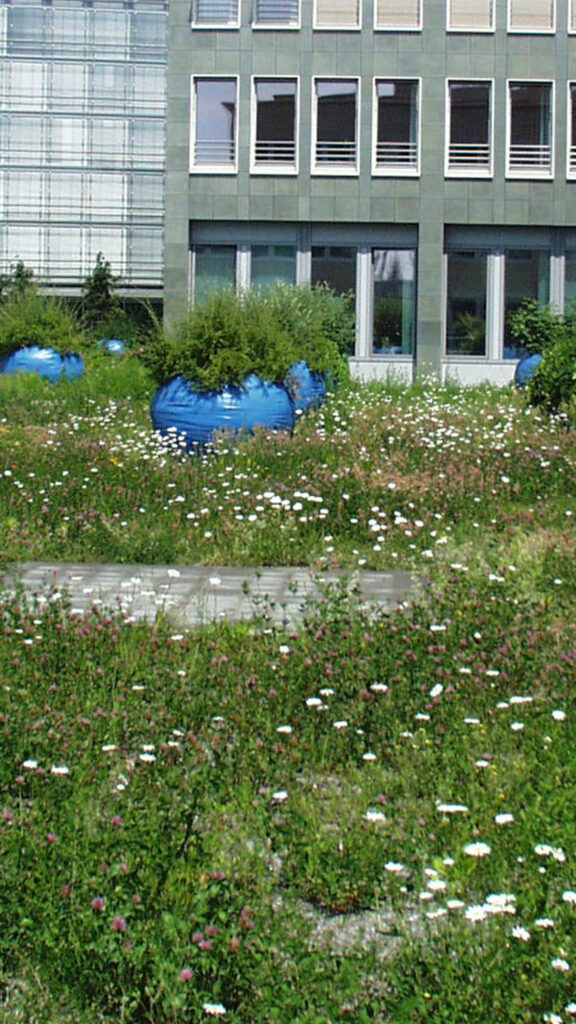 Die bewusst artifizielle Erscheinung der Gefäße sowie die Wahl der Bepflanzung verweisen auf die schwierigen Standortbedingungen: Das Gelände ist großflächig von Tiefgaragen unterbaut, wodurch nur eine geringe Substrattiefe und eingeschränkte Wasserspeicherfähigkeit des Bodens gegeben ist. Um dennoch eine adäquate Entwicklung der Vegetation zu ermöglichen, wurden die Pflanztröge mit Substraten in größerer Tiefe ausgestattet und gezielt mit robusten, trockenheitsresistenten Arten bepflanzt.