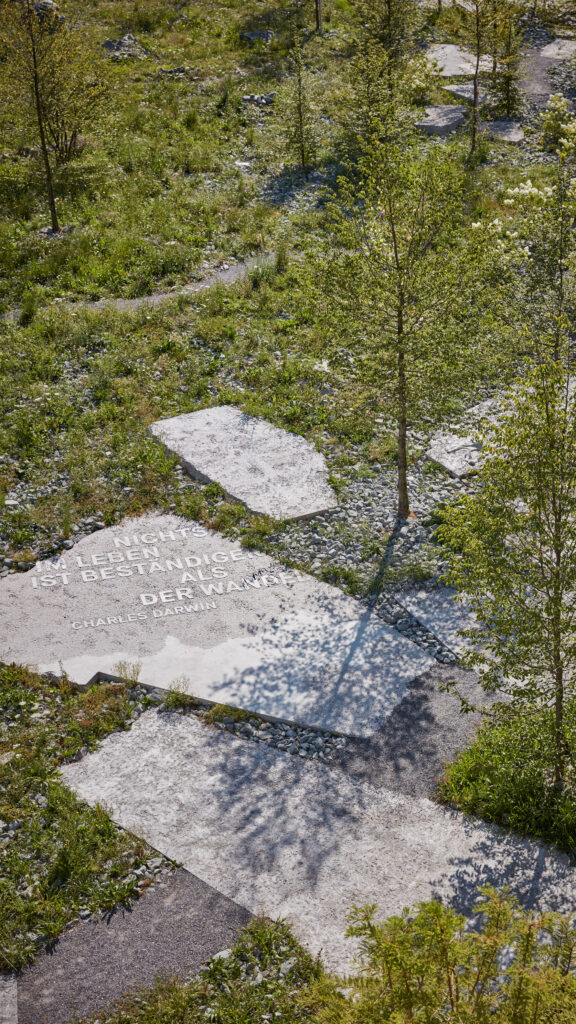 Zwischen Kirche und Museum positioniert, schlägt der Park zugleich eine Brücke zwischen Religion und Wissenschaft. Eingravierte Zitate aus der Bibel, von Charles Darwin und Max Planck eröffnen einen offenen Dialog zu unterschiedlichen Weltentstehungstheorien – eine Einladung zur kontemplativen Auseinandersetzung inmitten einer stillen Landschaft.