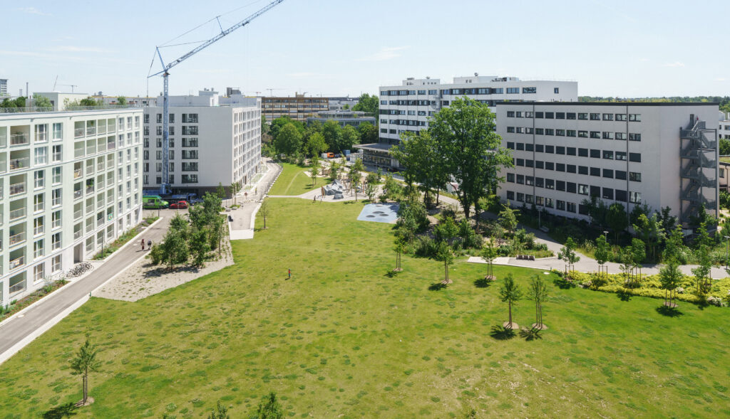 Eine sternförmig organisierte Parkfigur prägt das Erscheinungsbild des neuen Quartiers Am Südpark im Münchener Stadtteil Obersendling. Inmitten eines bislang durch Gewerbenutzungen geprägten städtischen Umfelds entsteht hier kein abgeschlossenes Wohnareal, sondern ein offener, vernetzter Stadtbaustein. Der Park verzahnt sich mit den angrenzenden Freiraumstrukturen der Innenhöfe, bindet übergeordnete Fuß- und Radwegverbindungen ein und wird so zu einem zentralen Freiraumknoten – sowohl innerhalb des neuen Quartiers als auch im stadträumlichen Kontext Obersendlings.