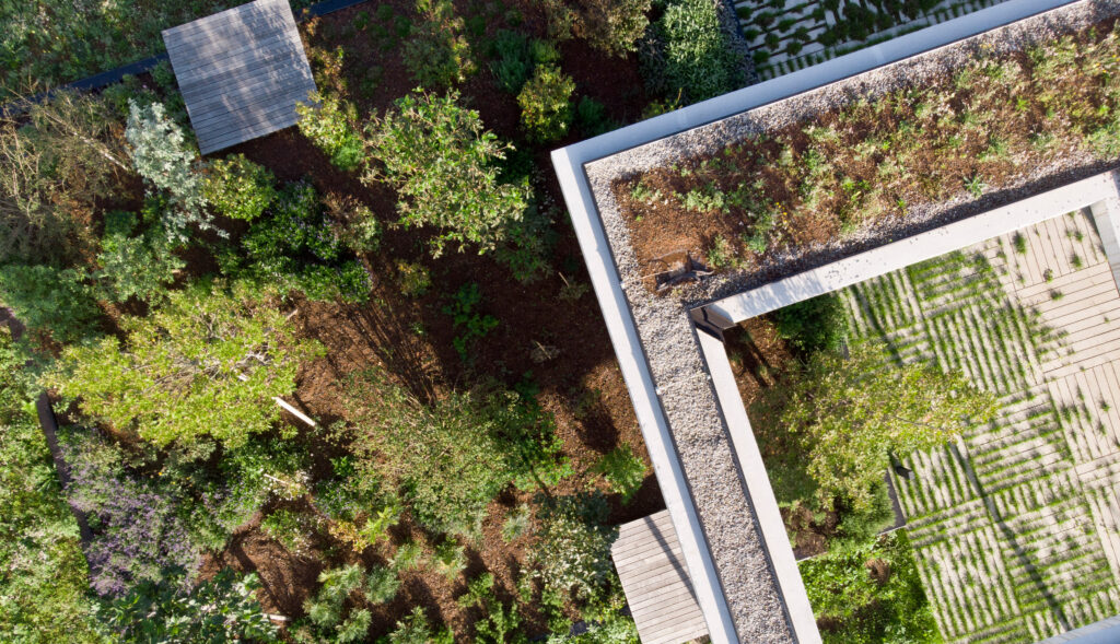Das Dach ist integraler Bestandteil eines dezentralen Wassermanagementsystems. Die intensive Begrünung und der Aufbau mit Hochbeeten ermöglichen die Zwischenspeicherung von Regenwasser. Durchlässige Wegestrukturen aus Rasenfugenpflaster ergänzen das System. Das gespeicherte Wasser wird in Trockenperioden langsam an die Vegetation abgegeben – ein ressourcenschonender Beitrag zur Klimaanpassung im urbanen Raum.