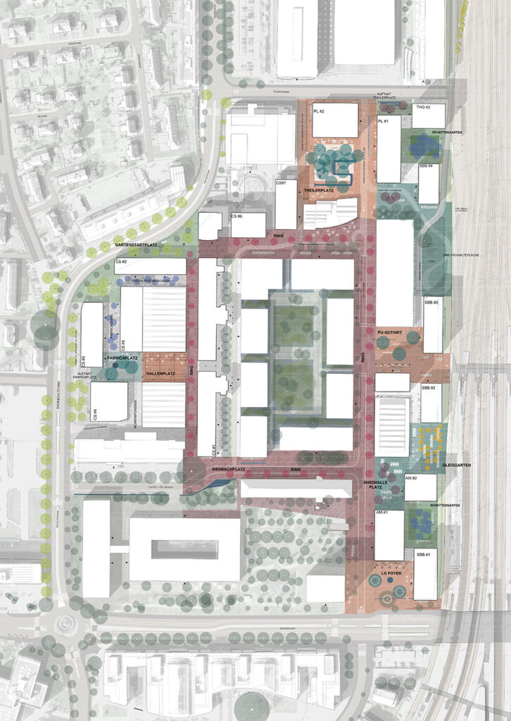 Das Freiraumkonzept basiert auf drei Kernelementen: einem umlaufenden Freiraumring, der alle Baufelder verbindet; den daran anschließenden öffentlichen Plätzen; sowie den seitlich angeordneten Gleisgärten. Die Typologie der Freiräume ist vielfältig, bleibt jedoch über Materialität und Raumstruktur miteinander verwoben. Die Plätze bilden jeweils prägnante Auftakte ins Areal und fungieren als Schnittstellen zu den angrenzenden Stadtquartieren.