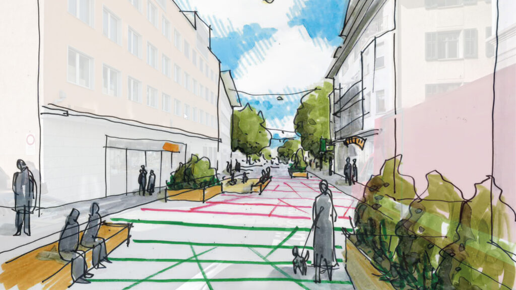 Die vorgeschlagenen Maßnahmen reichen – je nach Bestand und Bedarf – von flächigen Umgestaltungen wie Tempo-30-Zonen, Begegnungszonen, Fußgängerbereichen und Promenaden bis hin zu punktuellen Eingriffen: Pocket Parks, Parklets und Quartiersplätze als modulare Bausteine urbaner Aufwertung. In vielen Fällen werden Parkplätze reduziert oder ganz aufgehoben, um Raum für nachhaltige Mobilität und klimatisch wirksame Grünstrukturen zu gewinnen. Dort, wo es funktional erforderlich ist, bleiben Anlieferungszonen und Kurzzeitparkplätze bestehen.