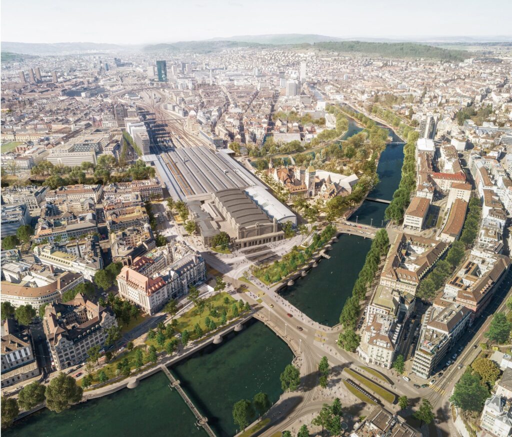Als Stadtraum schafft der Bahnhof Verbindungen – räumlich, sozial und funktional. Er soll inklusiv, flexibel nutzbar und atmosphärisch erfahrbar sein. Seine Lage zwischen Limmat und Sihl im Herzen der Stadt wird neu aktiviert: ein Raum, in dem Menschen, Verkehrsmittel, Maßstäbe, Nutzungen und Natur in dichter Koexistenz aufeinandertreffen.