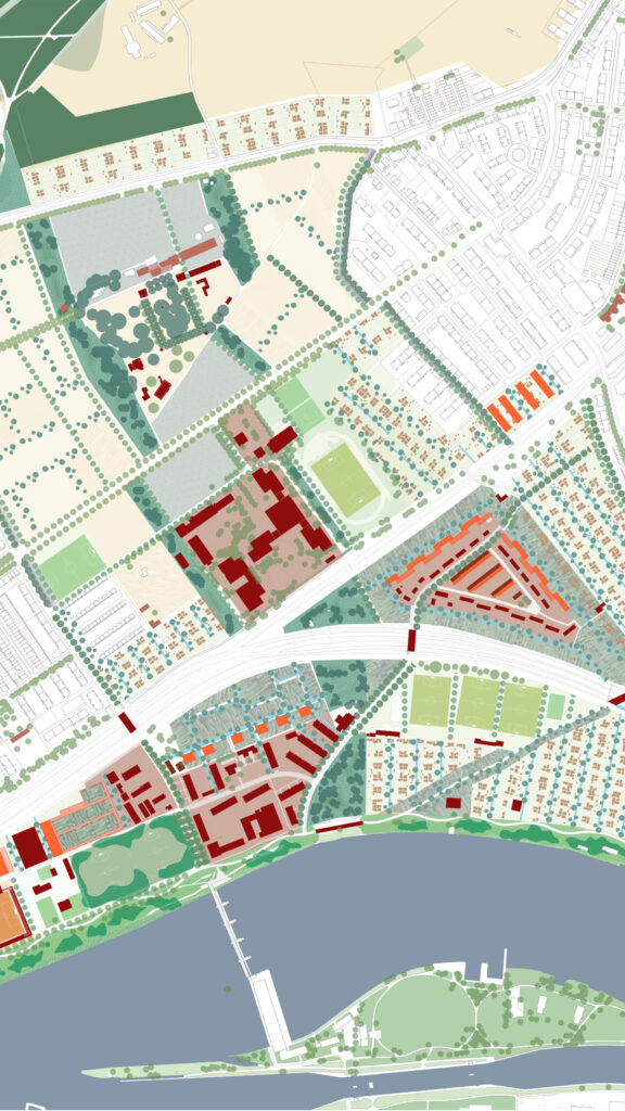 Die Felder sollen gemäß ihrem jeweiligen Potenzial weiterentwickelt werden. Die konkrete Ausformulierung innerhalb dieser Felder bleibt Verhandlungsgegenstand. Grundsätzlich ergibt sich eine Zonierung, bei der die Ränder des Gebiets freigehalten und für urbane Landwirtschaft sowie Gartenflächen genutzt werden. Die Mitte des Areals wird als „blaues Band“ entlang bestehender Wasserläufe mit öffentlicher Infrastruktur gestaltet. In der zentralen Zone sowie entlang des östlichen Ufers sind Gärten, Sporteinrichtungen und Wohnnutzungen vorgesehen, während das westliche Ufer vorrangig dem Freizeitsport vorbehalten bleibt.