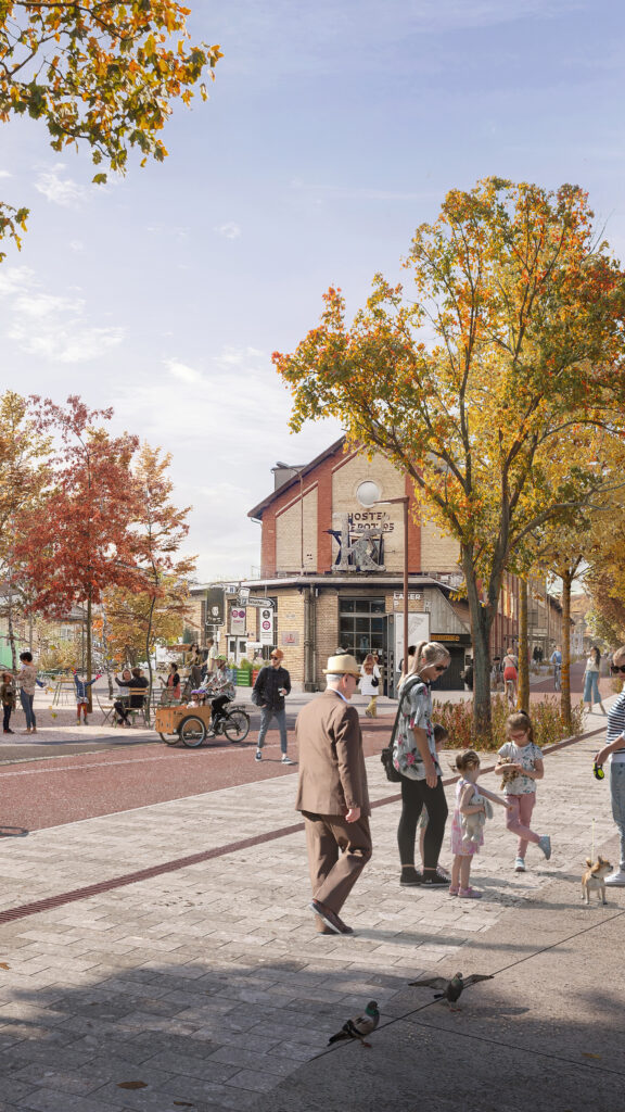 Das zentrale grüne Band mit einer Baumreihe im Straßenraum fungiert als prägendes Element und vermittelt die Idee einer „grünen Straße“, in der Natur und städtische Infrastruktur in einen neuen Dialog treten. Dieses