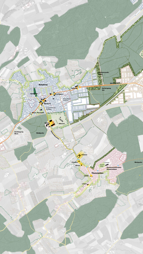 In der Siedlungsentwicklung stehen die Prinzipien der Innen- vor Außenentwicklung im Vordergrund. Dazu zählen die Verdichtung im Zentrum von Bützberg, der Erhalt der Weilerstruktur in Thunstetten sowie die qualitative Aufwertung öffentlicher Räume. Ziel ist es, vielfältige Aufenthaltsqualitäten und Begegnungsorte zu schaffen, die unterschiedliche Nutzer:innen ansprechen und flexible Nutzungen ermöglichen.