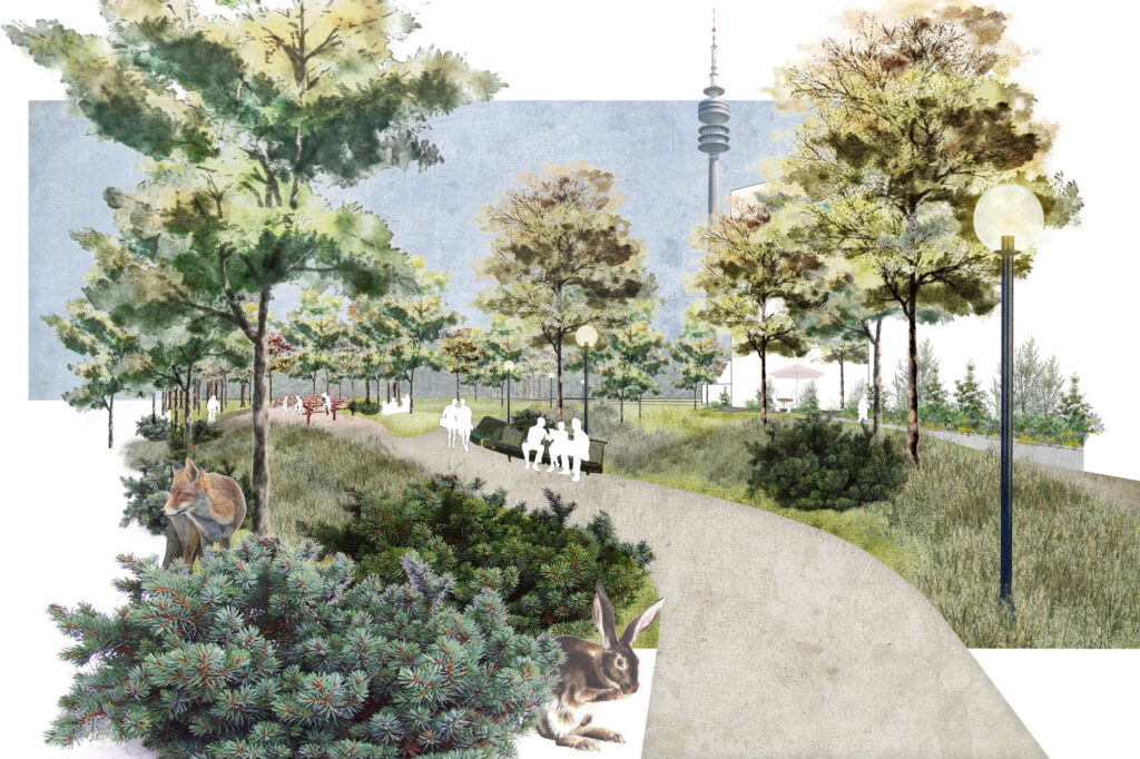 Durch die Überlagerung historischer und aktueller Schichten entsteht ein nachhaltiger Parkraum, der sowohl ökologisch als auch gestalterisch zukunftsfähig ist – ein öffentlicher Freiraum, der Erinnerung und Nutzung miteinander verbindet.