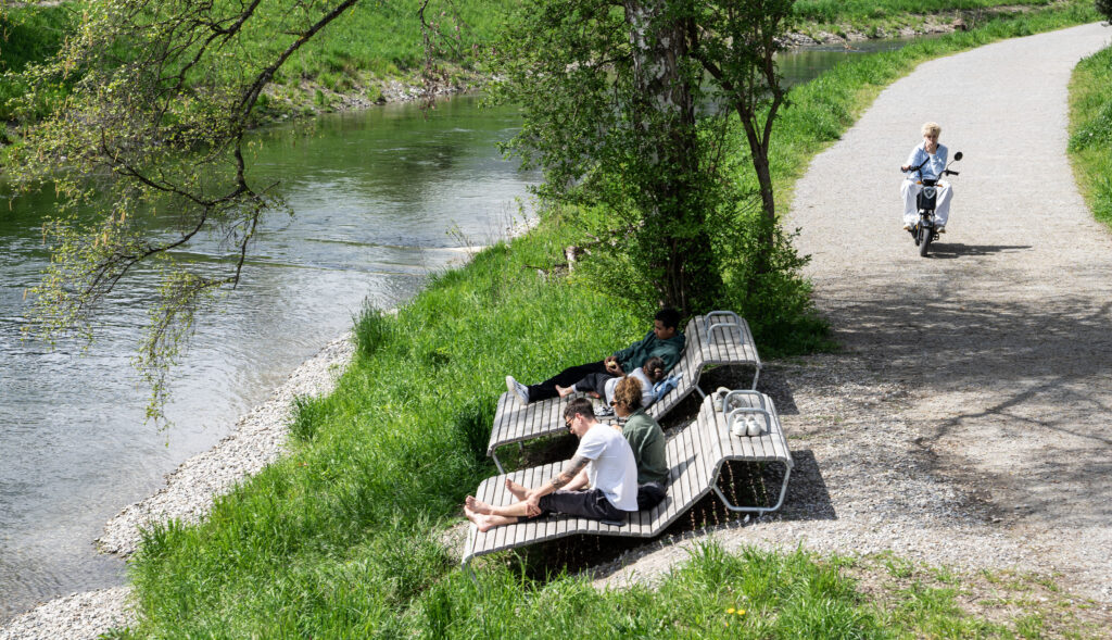 Die Möblierungselemente thematisieren nicht nur den Fluss, sondern laden aktiv zur Bewegung entlang des Weges ein. Jedes Objekt ist zugleich Teil eines Vita-Parcours, der zum sportlichen Durchqueren des Raumes anregt. Die Elemente ermöglichen sowohl körperliche Aktivität als auch entspanntes Verweilen – einzeln oder in der Gruppe, als spontane Lounge am Wasser oder als sozialer Treffpunkt im Alltag. Mit dem „Fil Bleu“ entsteht ein Parkkonzept, das langfristige stadt- und landschaftsräumliche Entwicklung mit kurzfristig sicht- und nutzbaren Qualitäten verknüpft. Der Flussraum wird nicht allein als landschaftliche Begleitstruktur der Siedlungsentwicklung gedacht, sondern als integraler Bestandteil eines übergeordneten Natur- und Stadtraums – ein dynamischer Ort zwischen Fließgewässer, Freiraum und urbaner Öffentlichkeit.